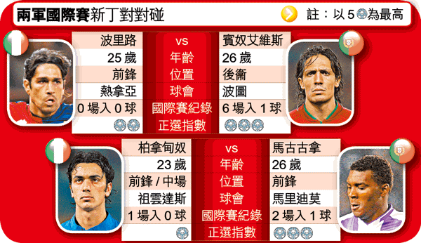 簡評:波里路今季替熱拿亞取得12個聯賽入球,終首度獲國家隊徵召,惜意大利前線已有東尼及廸拿達利,故波里路後備入替居多;而柏拿甸奴可墮後出任中場,令意大利戰術上有更多調配。葡萄牙中堅賓奴艾維斯在葡超的波圖越見成熟,今或壓過美拉任正選;適逢紐奴高美斯有傷,馬古古拿將與曉高艾美達爭正選一席。文:畢傑