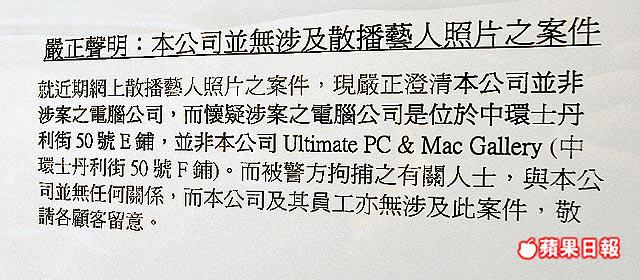 另外,事件困擾相鄰的另一間電腦公司,負責人擔心顧客誤會,昨在店門外張貼告示,嚴正聲明該公司並無涉及散播藝人照片之案件。