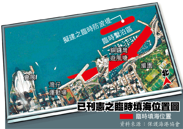 代表協會的資深大律師梁定邦指出,政府於去年7月刊憲,公佈「中環灣仔繞道和東區走廊連接路」工務計劃,需分階段進行臨時填海工程,主要是灣仔至銅鑼灣海旁對開,填海8.3公頃,另因現時銅鑼灣避風塘範圍會受影響,故計劃在銅鑼灣避風塘對開700呎填海2.4公頃,興建臨時防波堤,設立臨時繫泊區,供船隻停泊,臨時填海工程總填海面積達10.7公頃。