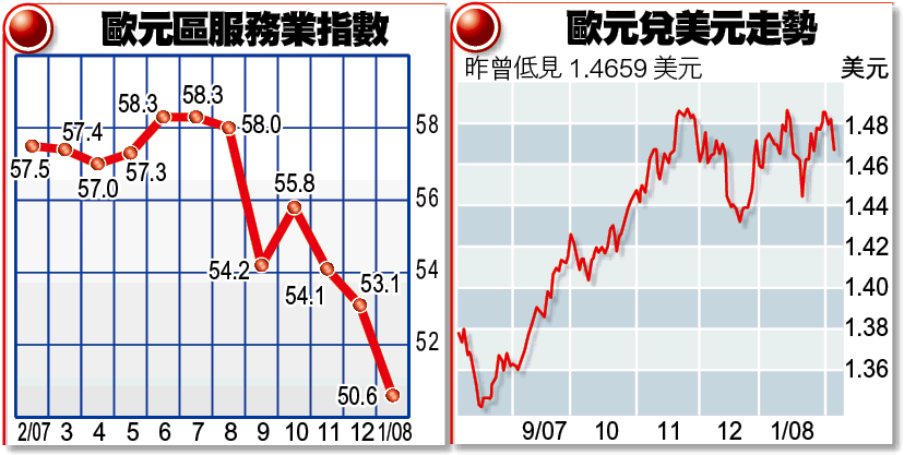 至於反映歐元區服務業表現的採購經理指數1月份向下修訂至50.6,為03年7月迄今低位,較原初統計的52及去年12月的53.1為低;其中德國、意大利和西班牙的服務業指數更跌穿50點的榮衰線,反映服務業正在收縮。