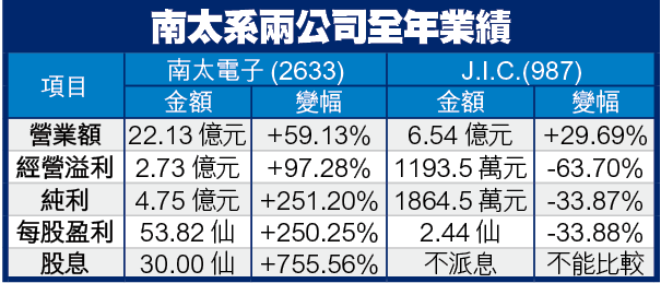 南太姊妹公司J.I.C.,昨日亦公佈截至07年12月底止全年業績,重組前期內備考純利1864.5萬元,減少33.9%,營業額約6.54億元,增加29.7%。