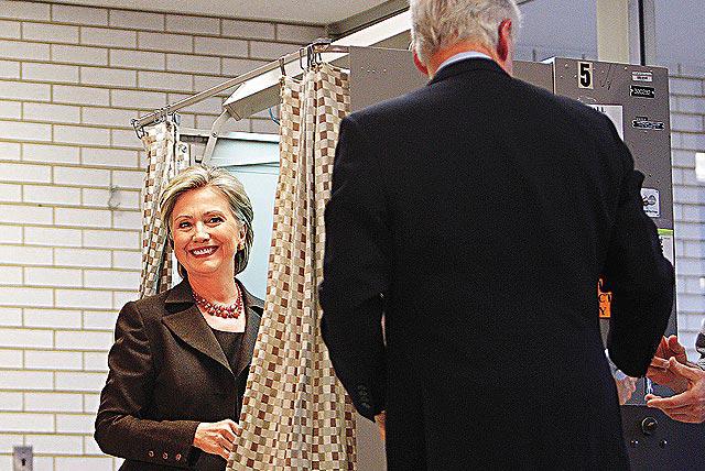希拉莉稍後再到麻省拉票,又返回紐約,上《大衞牙擦騷》爭取曝光。昨天大清早,她就在丈夫克林頓和女兒切爾西陪同下,在紐約票站投票,票站人員依規矩問她「你是民主黨人,是嗎?」,她以笑回應,更說「今天非常興奮,希望有很多人出來投票。」接着克林頓投票說:「這是我生命最驕傲一天。」