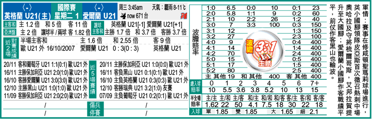 U21歐國盃外圍賽第3組周二進行出線關鍵大戰,英格蘭U21主場鬥愛爾蘭U21,主隊贏波幾乎篤定出線,憑艾朗連儂、侯度史東、禾確特等在球會大勇表現,捧「讓球主客和」「主勝」贏「壓歲錢」。(球賽編號:星期二1;now671台明日3:45am直播)