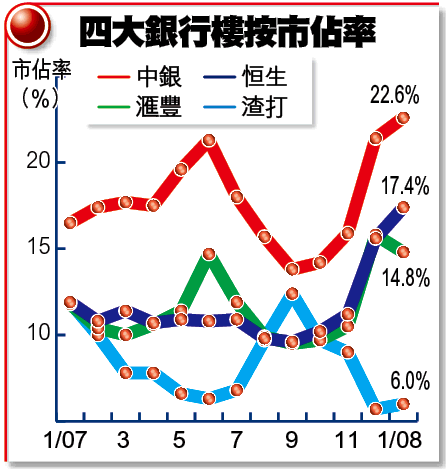 中銀香港(2388)繼續列居首位,佔22.6%,本地第三大銀行恒生銀行(011),樓按排名較去年12月躍升一位至亞軍,市佔率17.4%,滙豐排名則再跌一位至季軍,惟市佔率從07年的11.6%增至14.8%,渣打市佔率6%排列第四。
