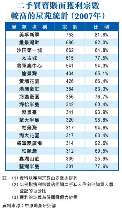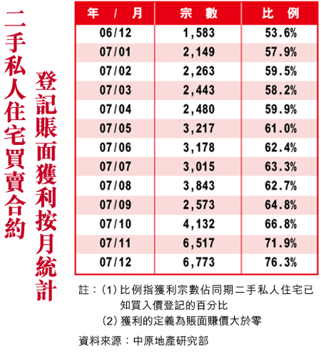 「07年第4季由二手帶動樓市,交投量明顯大躍進,去年住宅總成交宗數更突破近年新高,其中500萬元以下的中小型物業,已佔市場6至7成,至於屢錄高價成交的豪宅市場則佔約1成。面對樓市持續保持升勢,及對比97年樓價高峰期來看,今年中小型物業仍大有水位,預計全年可有30%升幅,單是第1季已有5%至8%增長。」中原地產執行董事陳永傑指出。