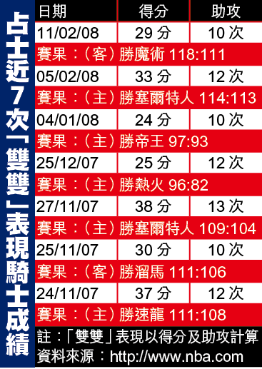 雖然今仗占士的風頭被曉士搶去,但他卻是球隊的真正奠勝英雄。連同今仗在內,占士在近7次於得分及助攻錄得「雙雙」表現的賽事中,騎士都能悉數獲勝(見附表)。換句話說,只要占士能夠如今仗般將得分重任委於隊友,自己則肩負起更多的策劃工作,為隊友製造起手空間和交出助攻,令騎士由以往的「1人球隊」變成一支團隊,騎士的勝機也將大大提高。綜合美國外電