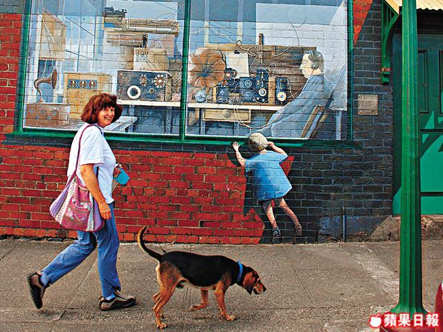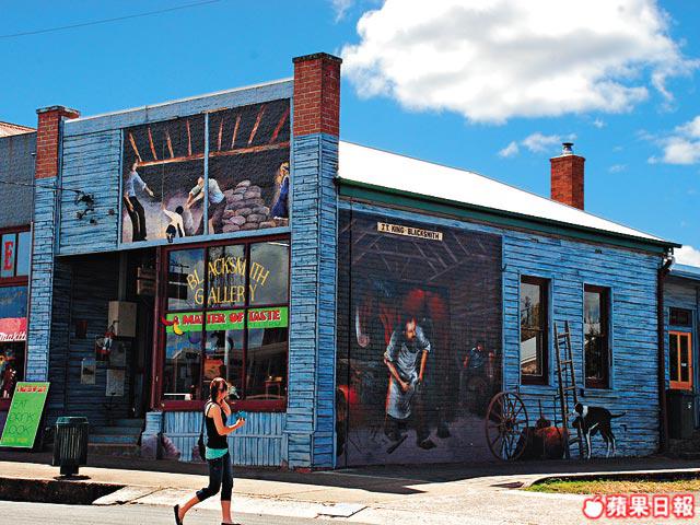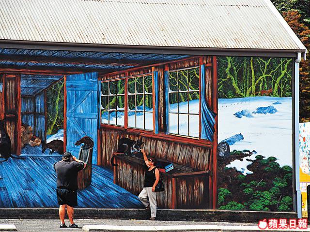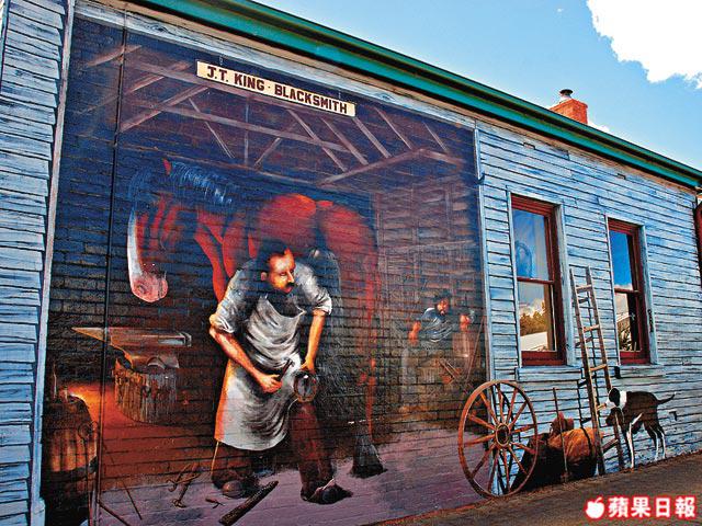 食飽後往西面開約一個小時,到達了一個富有藝術色彩的小鎮Sheffield。滿街都是色彩繽紛的壁畫,有的是塔斯曼尼亞著名的風景畫,有些是老百姓平常生活的情景。原來在七、八十年代,當地居民為振興當地經濟,開會研究後想出效法加拿大一個小鎮Chemainus,把家家戶戶的外牆都塗上壁畫。居民個個自覺地參與,由起初只得一、兩面牆做起,以至現在到處可見,成為旅遊景點。好客的居民亦邀Eason參與,讓他在公園的一面大牆上自由發揮,只花了個多小時,他就把自己獨遊山頭的景象畫了下來,遠遠還有架離他而去的直升機,這是他給「流放」在塔斯曼尼亞的真實經歷。公園旁展出的大量壁畫,出自當代藝術家或學生手筆,你家夠大的話可買一幅回家做手信,而Eason的傑作則是非賣品。