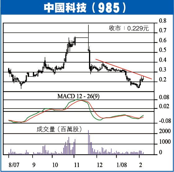 中科股價已重返去年未大升前水平,見底機會極大,現時股價已重上10日線(0.189元),只要股價守穩,10日線亦會好快穿越20日線(0.21元),確認調整完成,去年11月至今年1月徘徊區底部0.30元會有阻力,要整固蓄銳後才能破位而上。