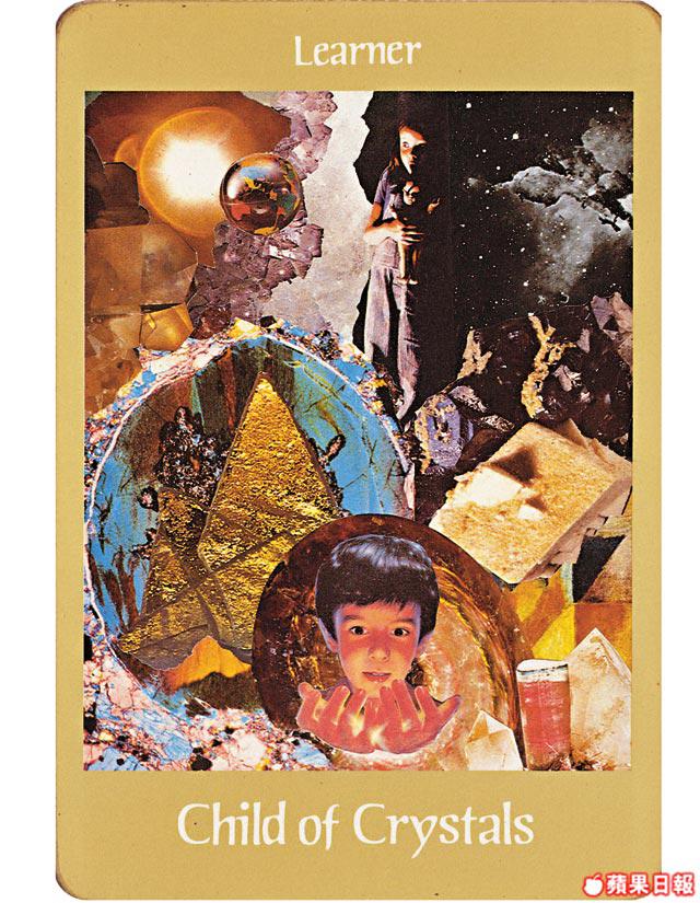 去到另一副牌「Voyager」,即潛意識位置,Winnie得到「水晶兒童」ChildofCrystals這隻牌,正好指出Winnie潛意識中憂慮的原因。這個他是Winnie從未接觸過的男孩類型,她以前的男朋友多是吃喝玩樂型,現在這個新男友,則是成熟、勤力上進型,她要像「學習者」Learner一樣,去學習、適應,在她內心深處,她就像牌中小孩子般小心翼翼地打開雙手去處理,但又像右上角的小女孩般,對這段愛情的前景,感到一種不明朗的黑暗所帶來的恐懼,這正是「人之魔術師」所認知的局限吧!不過,正如左方的日蝕般,明亮很快便會再次出現。牌意提示Winnie慢慢地愛,努力地學習相處之道,潛意識便會感覺到信心的成長,愛情路也會漸漸光明一片。