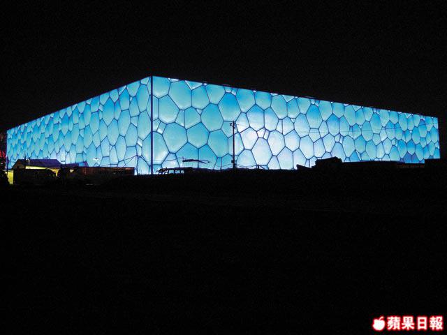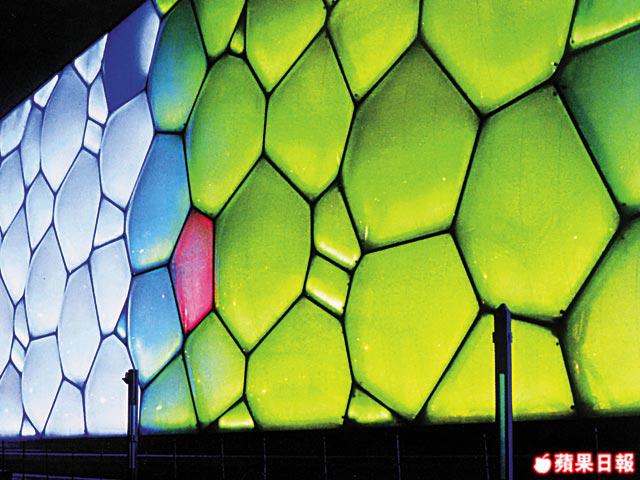 淺藍色「泡泡」、3,000多「有機細胞水分子」的構成,水立方是「體溫」會自動調節的「生命體」,水溫長年保持在28℃,連濕度亦保持在5、60%之間。她亦是超環保的「綠」象徵,用水很少,每年有14萬噸水可循環再用。建築界的傳奇,前無古人的神話,世上最大游泳館,建築費約15.6億港元,不足國家體育場鳥巢的一半,且集全球華人捐款籌建水立方,晴天時的水立方看起來是藍色,夕陽西下,它又變成黃色,陰天時則是灰色。這種隨天氣變幻的特性就像人的表情一樣。PTW建築事務所的其中一位設計者亦說過她是有生命的。晚上她又成了天地間一個「夜光盒」,時而艷藍,節慶與假日期間更七彩繽紛,一切一切就拜神奇的ETFE膠膜所賜。因為奧運會只有16天,象徵後奧運時代的「嬉水樂園」才是水立方的真正好玩勝地,還在興建中。