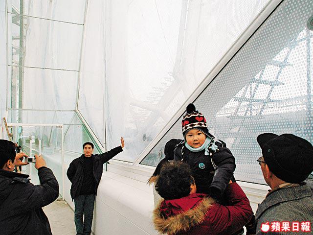 水立方的確好勁,但內部裝修卻好「流」!所謂「愛面子」有時倒變成「唔要面」!能說一口流利英語的北京人曾女士就狠批水立方工料差劣,女洗手間的廁格十居其九是踎廁,沒吹風機,非常多問題,她完全不敢恭維:「不應該是這種質量,在德國隨隨便便一間體育館都比你好!」她指着天花的牆身批盪、裂痕處處的燈座抱怨,記者則對洗手間外觀的庸俗設計和牆身質料手工最看不過眼。不過北京的小朋友如曹富嬌小妹妹就覺得場館很漂亮,她朋友仔都說要來看。還有來自芝加哥的Lic和荷蘭的Malou亦不管細節,對這非常尖端建築,五體投地。不過真正的夢幻「嬉水樂園」還在後頭呢。