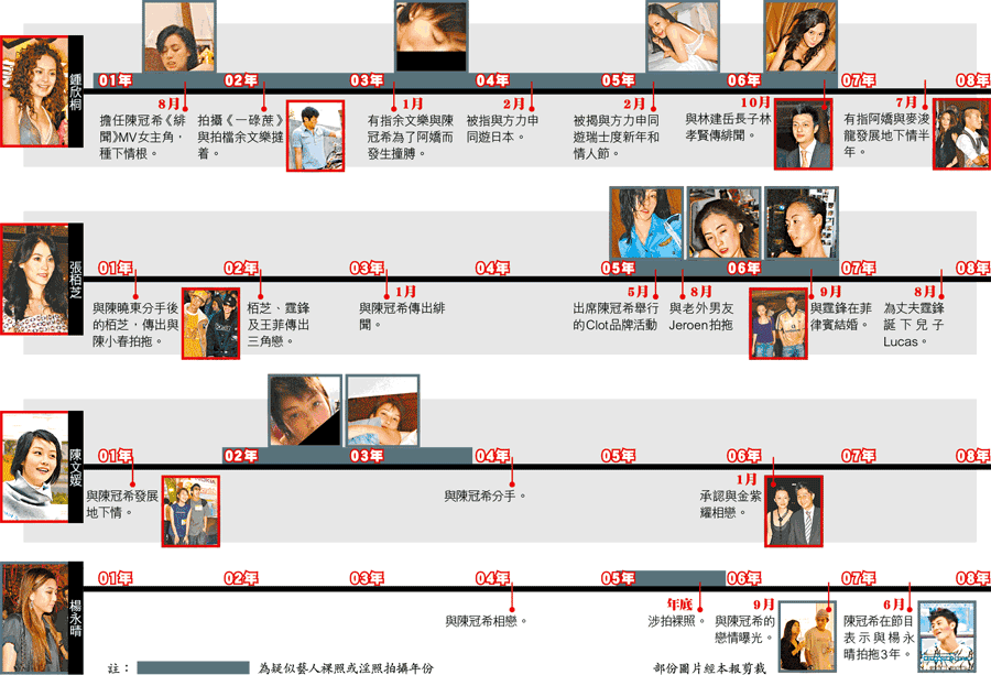 疑似藝人淫照風波震動全城,網上先後流傳多輯疑是藝人陳冠希(Edison)與鍾欣桐、張栢芝、陳文媛、陳思慧、陳育嬬及顏穎思的淫照,從這批照片的拍攝時間,更透視出幾位受牽連的藝人錯綜複雜的關係。