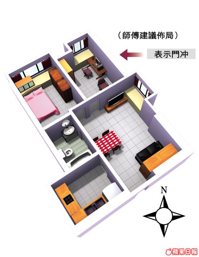 師傅指何氏夫婦二人命格均需要火旺加強運數,故整間屋應以紫、紅或棗紅作主色。剛好主人房門及廁所門前的空地為財位,師傅提議在廁所外牆上掛紅色時鐘以催財。