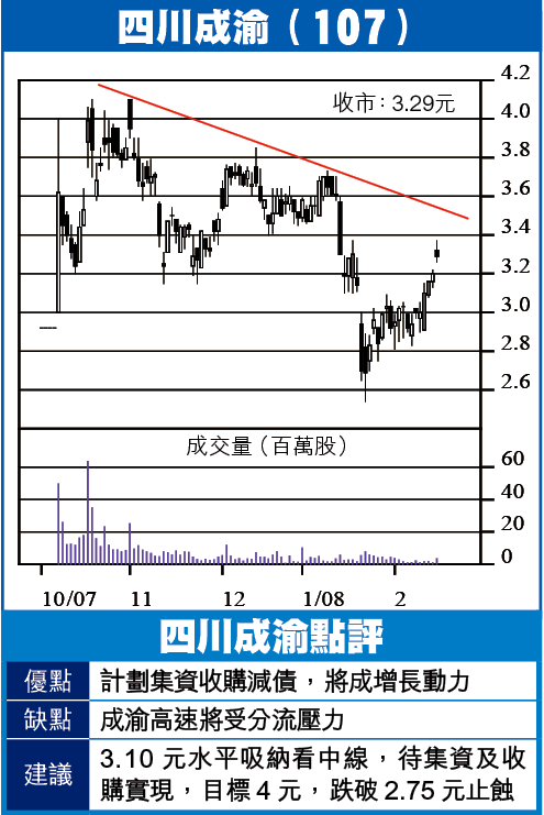 計劃發A股不多於5億股,集資約20億元,除用於收購外,其餘用於償還銀行貸款,去年底淨借貸13.6億元,集資對成渝財政有利,而收購的貢獻,仍待進一步資料披露。成渝現價3.29元,PE約16倍,息率1.3%,P/B1.48倍,今年展望原有業務明顯放緩,有待集資及收購配合,只宜候低吸納看中線。
