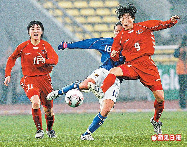 日本女足中場澤惠希(10號)與北韓的李金淑爭奪皮球。美聯社