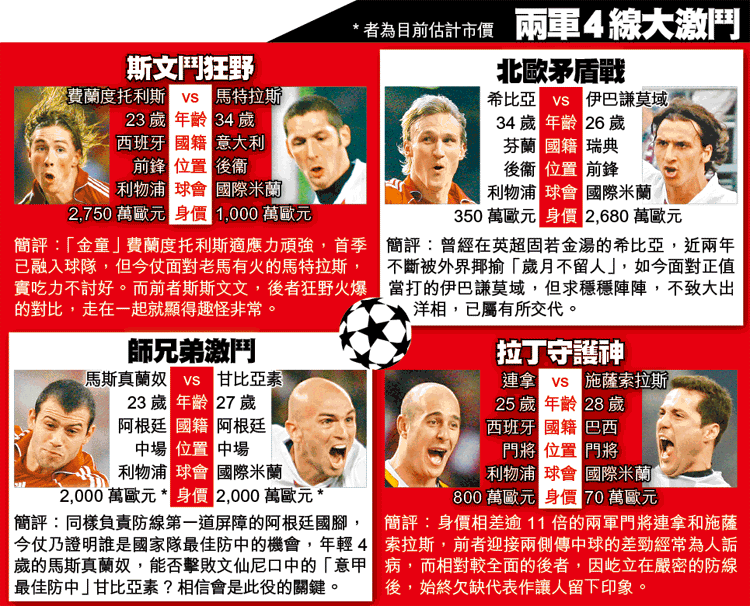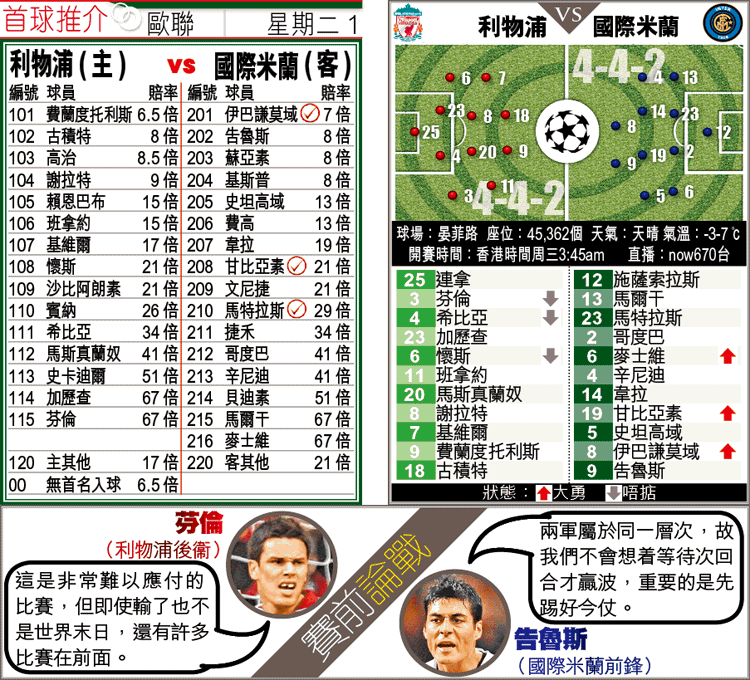 國米在歐聯分組賽獲得5勝1負首名出線,其中只失過4球,預料正選陣容先會派出勇悍兼具殺傷力的韋拉、史坦高域和甘比亞素出戰,重點培養的新星占美尼斯或先列後備,飾演奇兵角色;而側擊力銳利的麥士維,在左路後上助攻,正好食住攻強守弱的班拿約,以及出現退化的芬倫。