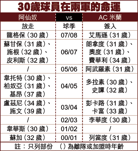雲格對年近30歲或以上球員,多數不會留用,即使是自己的愛徒亦「冇情講」;如球迷不善忘,應該記得比堤、韋拉及亨利即將踏入30歲前,他以高價把他們送到意甲或西甲。