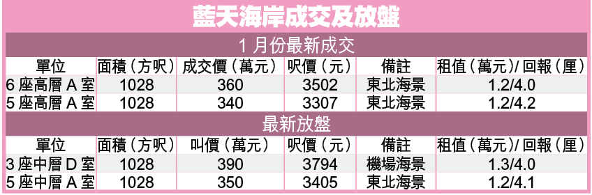 中原陳繼成表示,藍天海岸第1至5座現時有百餘個放盤,平均叫價每方呎約3560元,千呎以上3房單位才有海景,當中以機場海景較有保障,平均呎價3800至3900元,但放盤不多。
