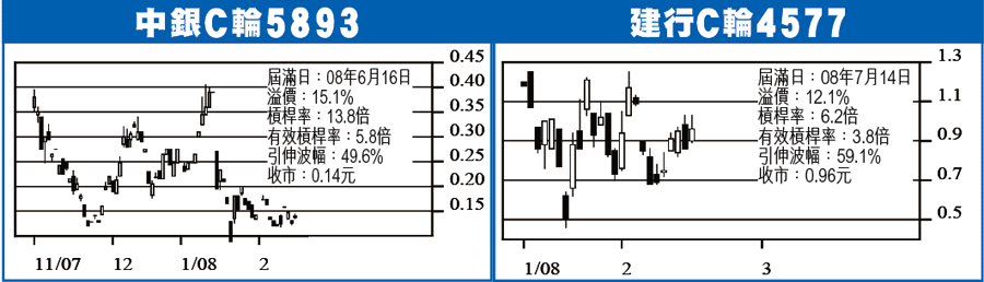 ■建行C輪4577收0.96元,升0.10元,成交158球。此輪08年7月14日到期,行使價5.688元,溢價12.1%,槓桿率6.2倍,有效3.8倍,引伸波幅59.1%,街貨4%。正股見6.30元,此輪理論價1.203元,升25%。