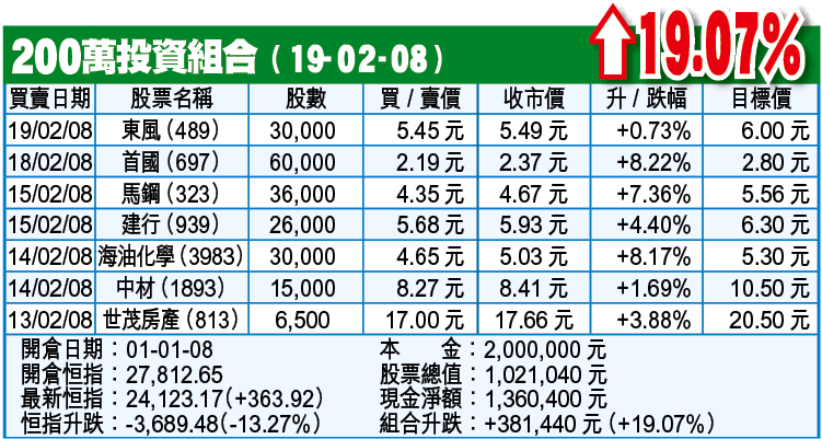 東風(489)昨已入貨,止蝕位推上5.2元;首國(697)計數位上移至2.2元;馬鋼(323)改以跌穿4.37元離場;建行(939)改以5.7元計數;海油化學(3983)升勢甚勁,目標價推高至5.3元,止賺位上移至4.85元,其餘各股策略不變。
