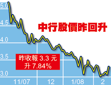 中行董事長肖鋼日前報喜,透露去年純利有明顯增長,更已為次按提供足額撥備,令中行昨一洗頹風最多飆9%,收報3.3元,升7.8%,成交35億元排活躍榜首位。消息亦刺激中資銀行及保險股全線起動,帶動恒指重越24000,收市升363點,報24123點。本港時間昨晚11時半,道指升逾100點,滙控(005)及中移動(941)在美國預託證券(ADR)靠穩,前者折算約115.6元,較港收市高1.2元,後者則報119元,較港低0.2元。