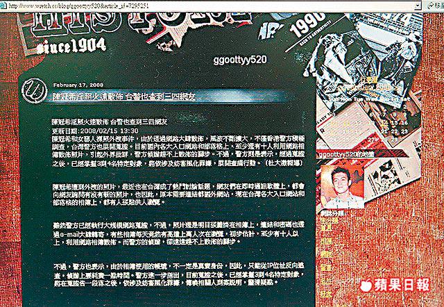 另外,台灣一名24歲男子因在網站提供相關淫照,以及標榜有陳冠希現任女友楊永晴18歲時自拍的性愛影片供網民下載,遭當地警方控以散佈猥褻物品罪,但警方無法判斷影片中的女角是否楊永晴。