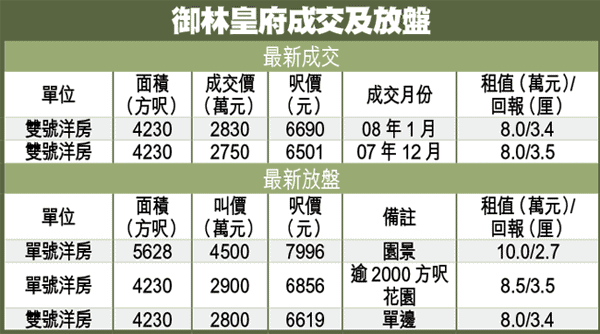 葡萄園屋細,入場費最低;St.AndrewsPlace盤源最少最矜貴,呎價動輒過萬元,介乎兩者之間的御林皇府,現有19個二手放盤,面積最細的4230方呎洋房,呎價6000餘元有交易,至於為數僅5座的7643方呎獨立屋,叫價約1億元,每呎約1.3萬元。