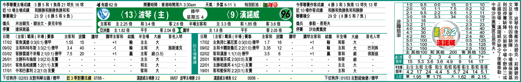 波琴及漢諾威同是攻強守弱,故周五在前者主場進行德甲聯時,首選1.62倍入球「大」;而考慮到漢諾威人腳較好,有力取得歇冬後首場勝仗,「讓球」平手值得捧場。(球賽編號:星期五4;有線62台明日3:30am直播)吾中