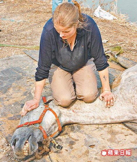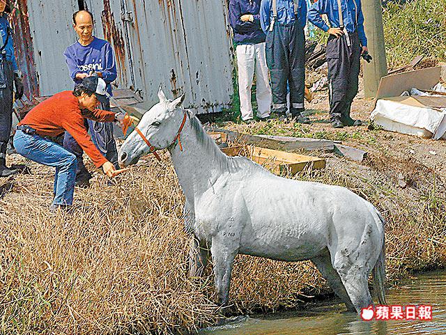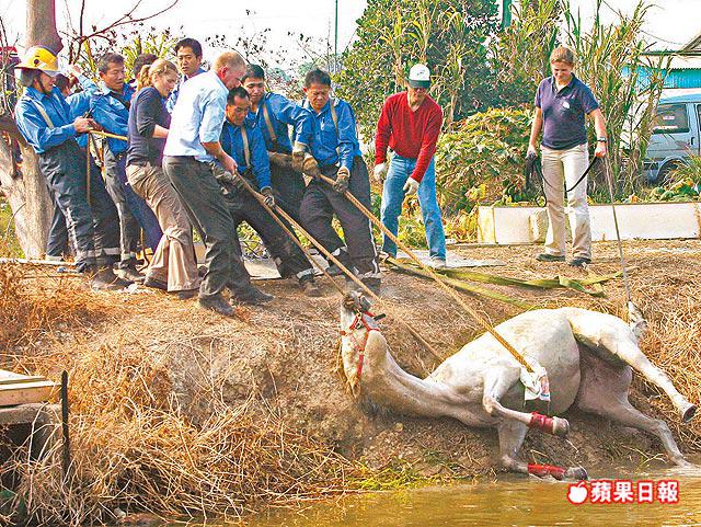 可是重達453公斤的白馬幾度嘗試仍未能爬回岸上,三名外籍獸醫到來視察,當時白馬已筋疲力盡,四蹄亦擦傷流血,獸醫決定替牠注射鎮靜劑,令牠情緒穩定下來,然後由在場14人合力將白馬拉回岸上,化險為夷。