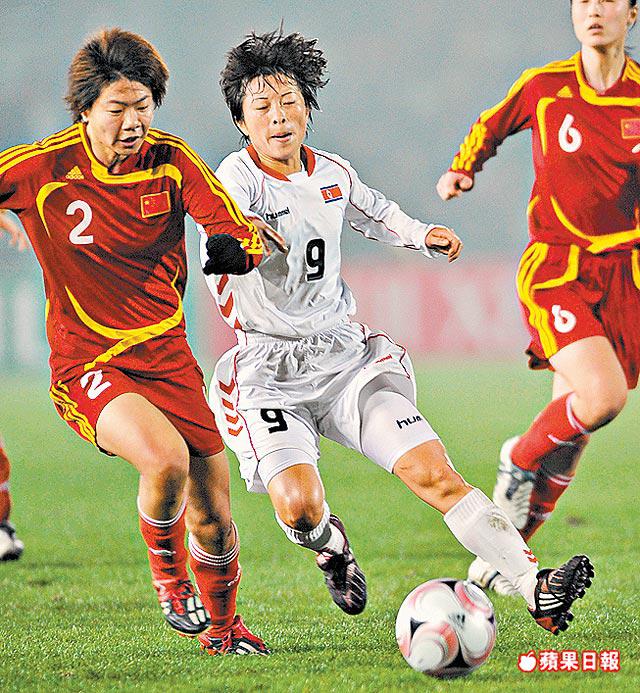 周四東錦賽女子分組第2場賽事,中國僅賽和北韓0:0,暫兩戰得4分,最後一輪將與6分的日本爭冠軍。圖為中國的袁帆(左)力迫北韓的李銀淑。新華社