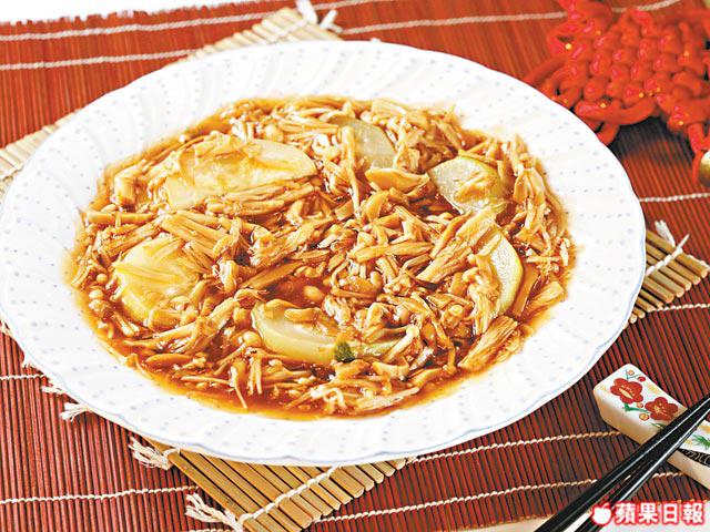 用金菇扮瑤柱,最緊要將金菇用細火㷫亁水份,當變成金黃色的時候,像真度非常高。