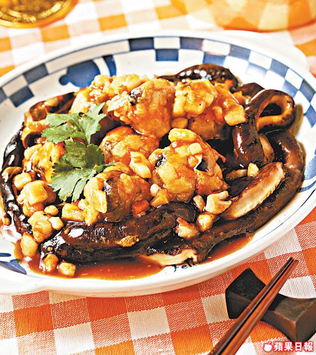 用冬菇做鱔,雜菜菇類切粒做肉丸,記得生粉不要加水攪勻,這樣肉丸才會變得更黏。