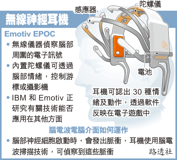 這款由美國EmotivSystems公司研發的EPOC神經耳機,賣299美元(2,332港元)。使用者無論喜怒哀樂或緊張,甚至扮鬼臉,腦部都會發出脈衝,耳機會讀取這些電子訊號,然後在使用者正進行的電子遊戲中顯現出來。