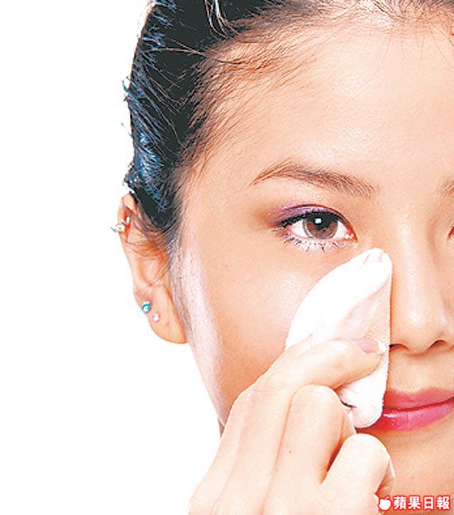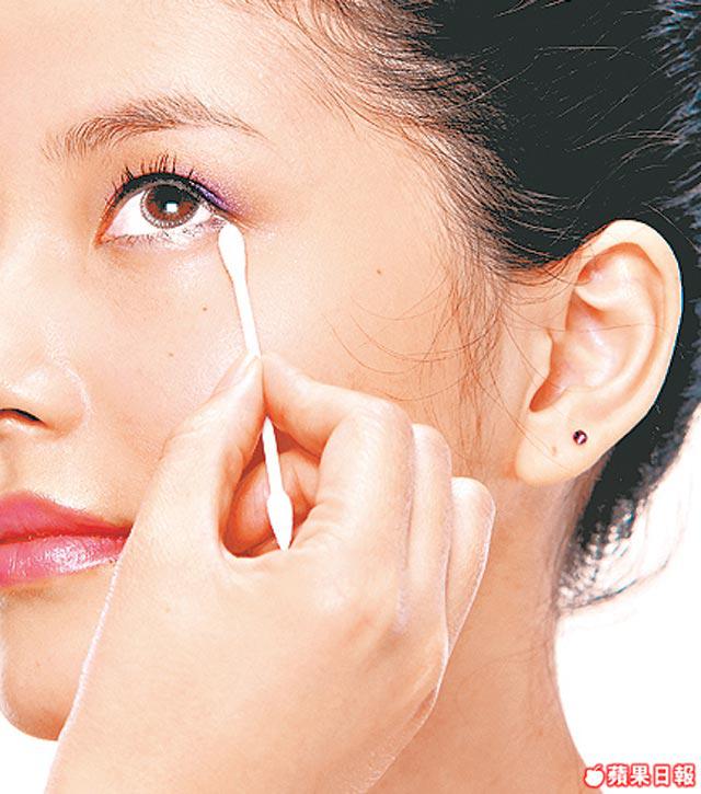 2.眼肚上的睫毛液,先用棉花棒沾上眼霜或eyegel,慢慢由眼角往後推至眼尾位置。如沒有眼霜在身,可用潤唇膏代替;太亁燥而令眼紋暴現的,亦可以此方法,由內至外,輕輕捲走多餘的粉底。