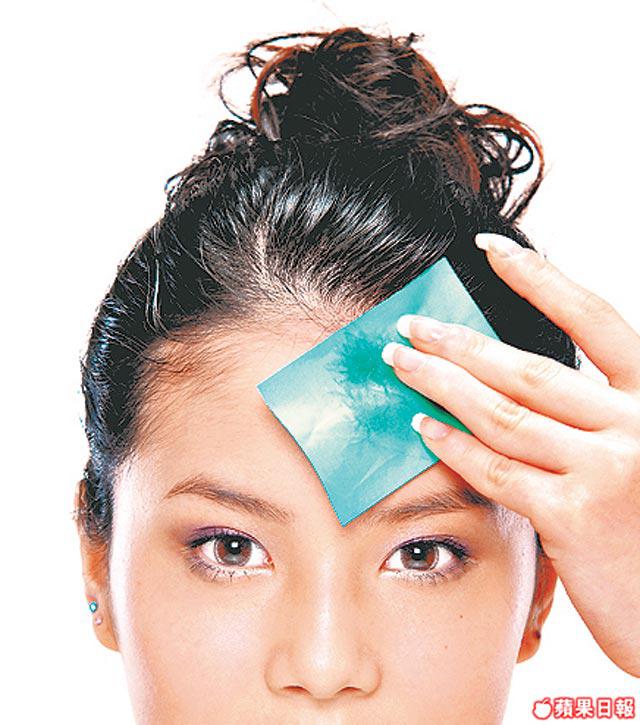 1.先以面油紙輕輕印走多餘油脂,切忌出力抹!沒有面油紙的,可以紙巾裹住粉撲代替,印走油光。