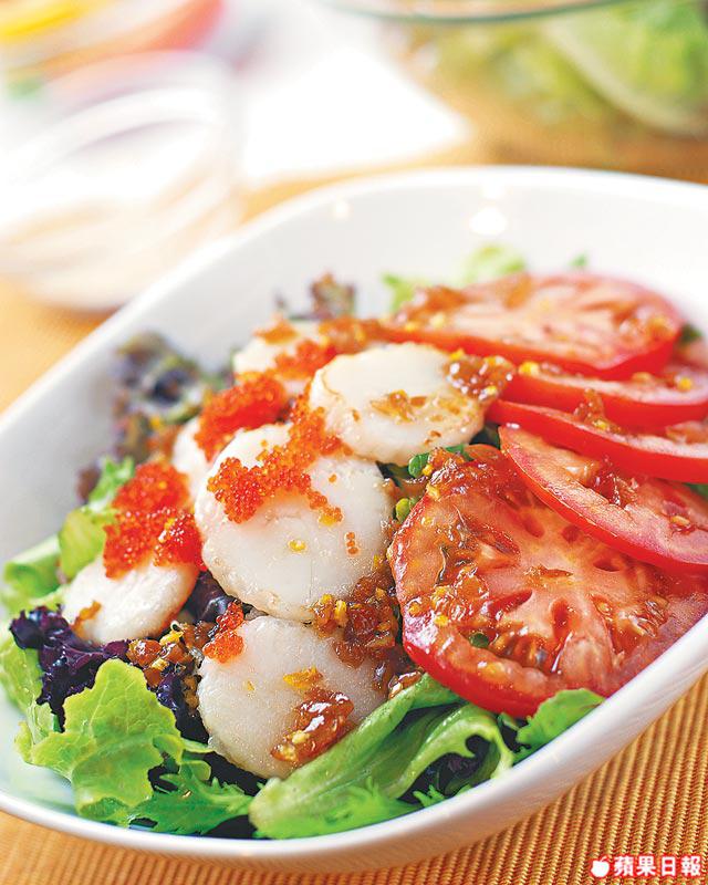 帶子2両、野菜3両、鹹柑桔2個、鮮檸皮1/2茶匙、蜜糖2湯匙、橄欖油1茶匙、蟹子1/2茶匙、番茄1個、海鹽少許