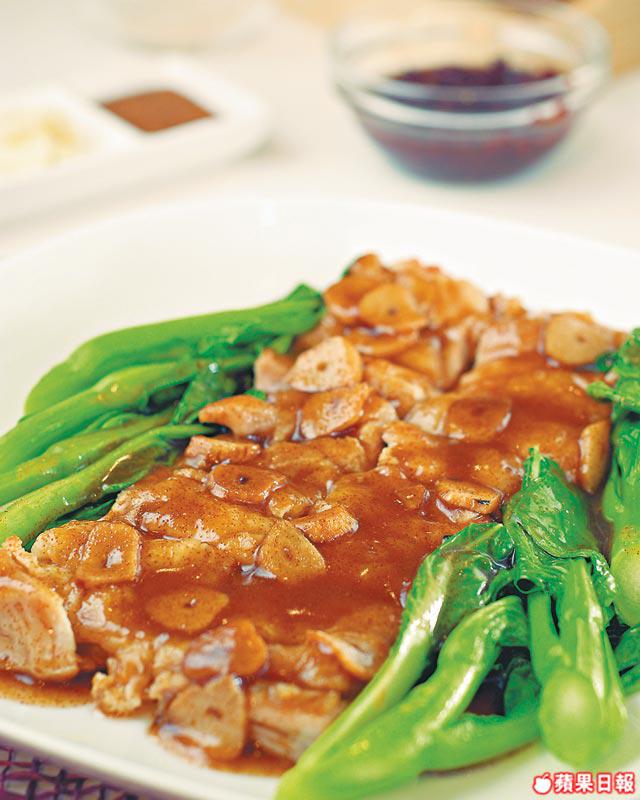 3.再起鑊,把上湯、炸香蒜片、蝦子醬及蠔油煮熱,埋芡淋上面即可。