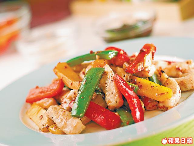 3.最後加入鹽、糖及生粉,再加紅椒角兜勻埋芡便可。