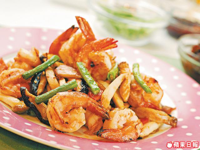 2.野菌洗淨瀝亁,煎至金黃色;將蒜茸、薑葱和XO醬爆香,加入圍蝦和野菌,灒酒一起兜炒。