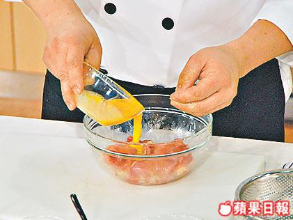 答:加少少雞蛋醃雞,雞肉會煎得更金黃,賣相更好。