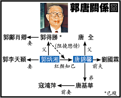【本報訊】華麗家族頓生巨變,牽動3,600億元地產王國的利益角力,更揭開豪門長子一段鮮為人知的半生緣。被指與新鴻基地產主席郭炳湘突然休假有關的女子唐錦馨(IdaTong),原來早在40年前已結識少年郭炳湘,卻因郭父反對,兩人被迫分開。直至郭炳湘97年被綁架獲救後,兩人舊情重燃,昔日的紅顏知己逐漸成為他身邊最倚重的女人。 記者:劉碧思、潘鳳蓮、梁洵瑜、張珮琪