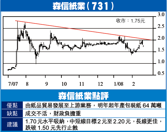 森信現價1.75元,預期今年3月止年度PE11.6倍,如造紙業務順利,下年可增長1倍,後年可再增1.5倍以上,中長線將脫胎換骨,只是成交不多,影響表現,相信會炒高配售新股或發行債券,估計大市轉穩後,即有表現。