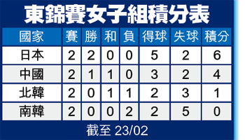 至於尾場中國主場對日本屬冠軍之爭,主隊兩戰得4分,比日本女足少兩分,要捧盃就非勝不可。然而,今仗她們有主將畢妍因停賽缺陣,中場戰力受損,難贏日本;而日本在對上兩場全勝,其中包括贏強隊北韓3:2,可見狀態很好,加上陣中不乏好手,例如是荒川惠理子及澤穗希等,故有力與中國一拼,[+1]「客勝」值得捧場。