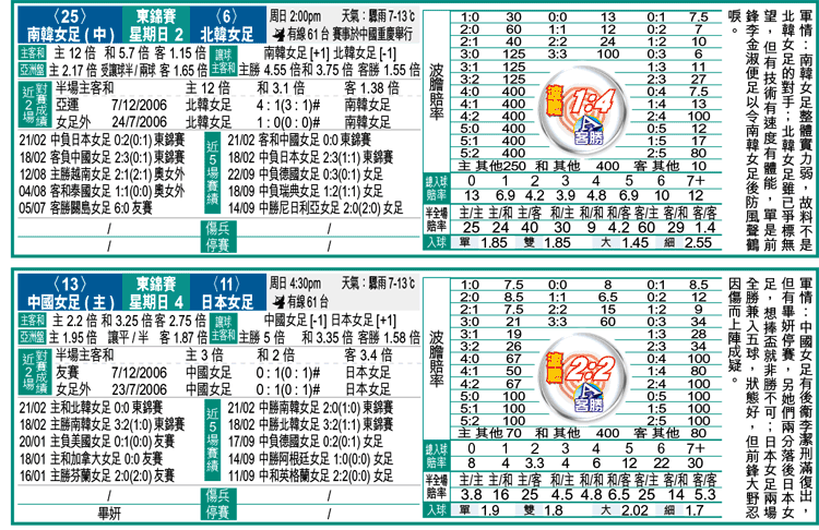 以北韓女足的實力,沒理由在今屆東錦賽3戰不勝,周日最後一輪對弱隊南韓女足,相信是開齋之時,重插[-1]「客勝」;至於尾場,日本女足表現對辦,鬥中國女足受讓,當取[+1]「客勝」(球賽編號:星期日4;有線61台今日4:30pm直播)。