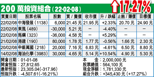 由於兩大指數的三角形尚未破位,故本組合尚未開淡倉,但仍會保留原策略,若見確認破位,就會入市開倉。倉內的東風(489)和馬鋼(323)已分別止蝕和止賺,海油化學(3983)開市時低於止蝕位,但只是質了Buyer一兩萬股,小邱未及有動作已升回5元之上,故未離場。