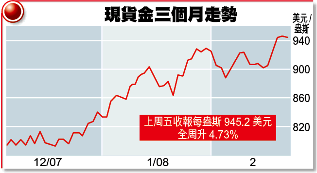 國際現貨金上周升42.7美元或4.73%,以百分點計是去年11月23日當周以來最大升幅,收報每盎斯945.2美元。