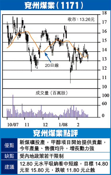 兗煤規模較細,又以銷售現貨為主,因而評價較低,理由是現貨價會反覆,合同價較穩定,從另一角度看,現貨價升,兗煤即時受惠,不必等待再訂合同,現貨價暫被干預,估計不久之後將取消,而電煤合同價亦將上升,現價13.26元,去年PE約18倍,預期今年增長可達50%以上,可趁低吸納持中短線。
