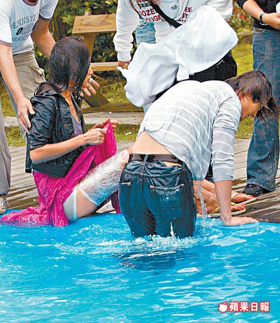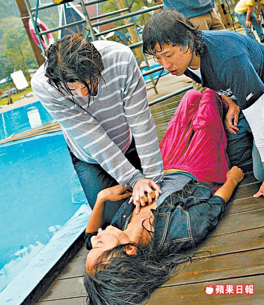 當時蔣怡坐着輪椅衝向池邊,頭兩回輪子卡住池邊縫隙,摔不下泳池,第三次蔣怡終於跌落水,卻被水嗆到臉色發白,無奈又要重拍。到第四次,蔣怡成功入水,卻不慎走光。郭品超落水時,額頭不慎撞到水底的攝影機,當場血流披面,認真當黑! 採訪、攝影:黎寶蘋