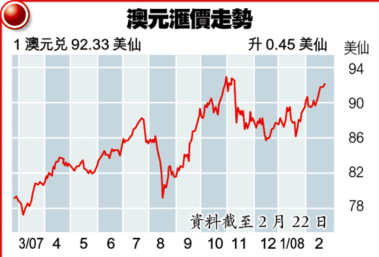 陳健豪表示,澳洲央行剛公佈的核心通脹為3.75%,反映澳元仍有加息空間,相信今年兌美元很大機會升穿一算,建議投資者在87至88美仙水平買入澳元,基於經濟好、利率高及抗跌力強,澳元將繼續成為外滙巿場的寵兒。