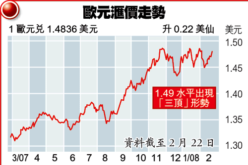 至於歐元兌美元,在1.49水平已出現「三頂」的不利形勢(見圖),加上估計歐洲央行4、5月有機會減息,歐元形勢更為不妙,料會下試1.4水平;紐元形勢亦與歐元相若,每紐元兌美元在80美仙水平明顯有阻力,料新西蘭年中亦開始減息,紐元今年有機會重返70美仙水平。
